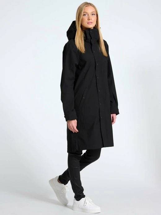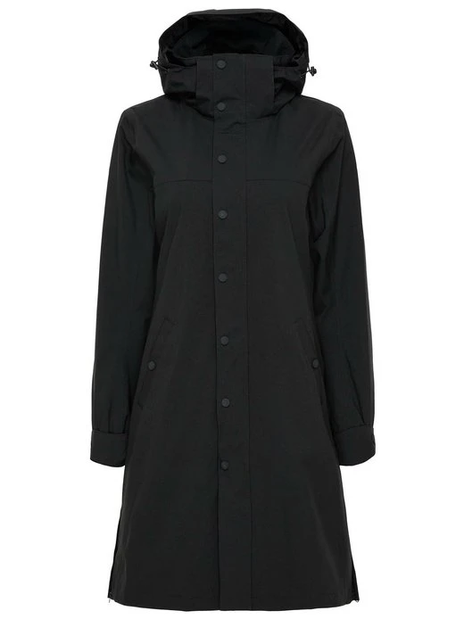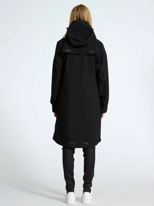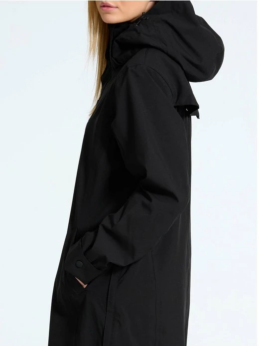 Knielange Funktionsjacke aus recyceltem Obermaterial mit Reißverschluss und Druckknöpfe. Kapuze ist beide verstellbar und abnehmbar.