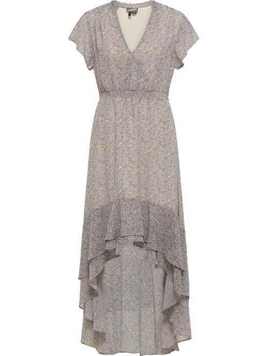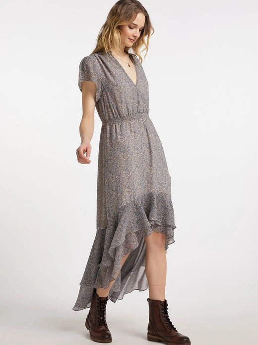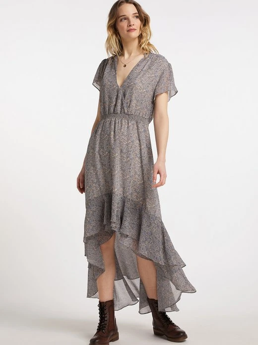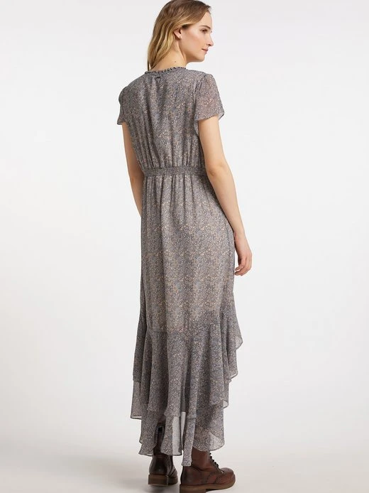 Begrüßen Sie den Sommer in dem beschwingten Kleid von DreiMaster Vintage. Die kurzen, semitransparenten Flatterärmel, ein kleiner gesmokter Stehkragen, der zarte florale Print und die romantischen Volants am Saum zeichnen eine feminine Silhouette, wobei die Vorderseite deutlich kürzer geschnitten ist, als die Rückseite. Eine gesmokte Taille und die Wickeloptik am V-Ausschnitt komplettieren das stimmige Gesamtbild. Das fließende Material trägt sich dabei angenehm weich auf der Haut und lässt Sie im Handumdrehen auf jeder Gartenparty glänzen.