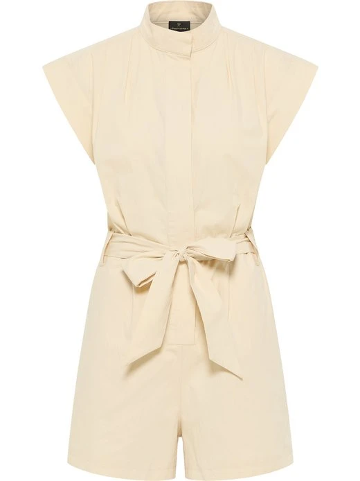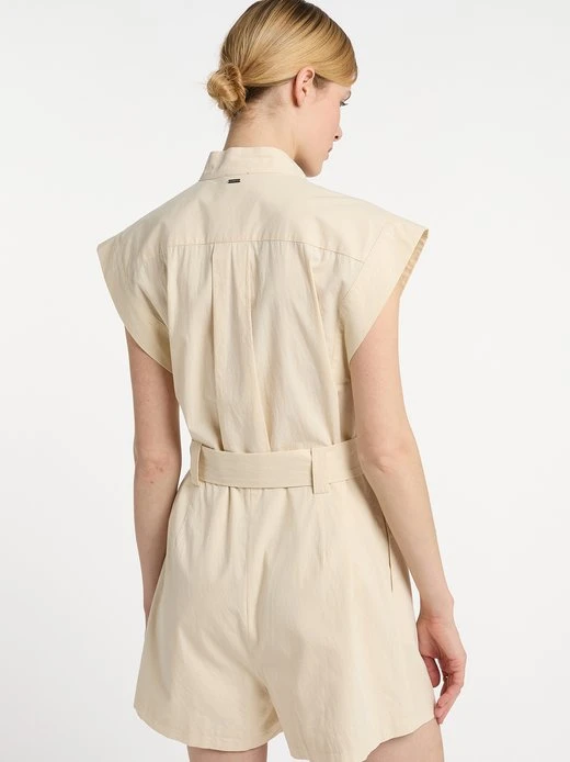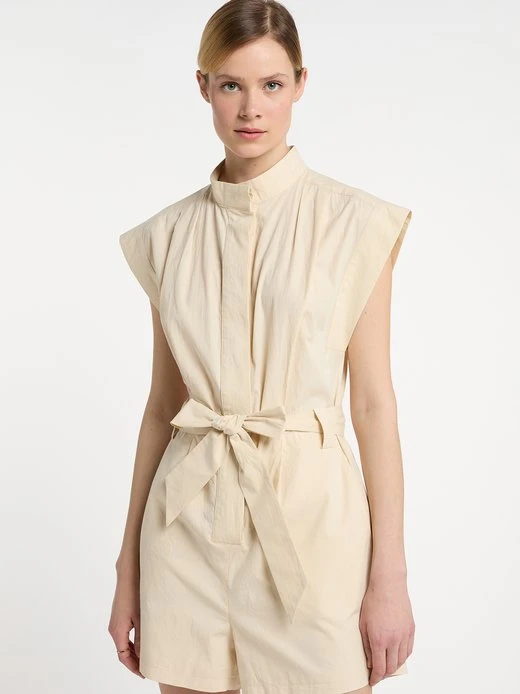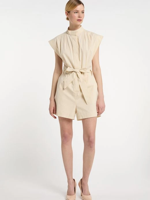 Mit diesem Playsuit beweist DreiMaster Klassik, dass auch die kurze Variante des Jumpsuits ausgesprochen elegant aussehen kann. Das aus Baumwolle gefertigte Modell verfügt über ein ärmelloses Oberteil in Blusen-Optik, das durch Falten an den Schultern sowie an der Taille definiert und durch eine verdeckte Knopfleiste akzentuiert wird. Der kleine Stehkragen und die seitlichen Eingrifftaschen runden das Modell ebenso ab wie der Taillengürtel, der vorteilhaft Ihre Silhouette betont.