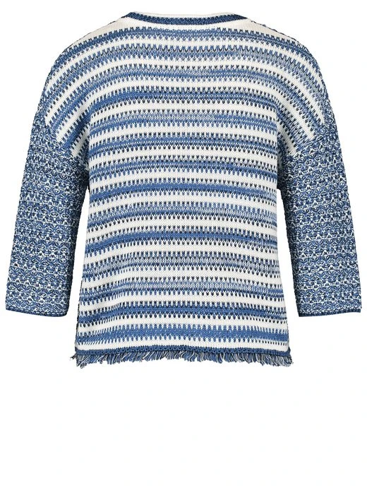 So schön ist Strick: Dieser figurumspielenden 3/4 Arm Pullover besticht durch einen auffälligen Strick-Mix und eine feine Fransenkante am Saum. Schaffen Sie ein modisches Erscheinungsbild und genießen Sie die Kombination aus luxuriösem Tragegefühl und modischem Statement.
