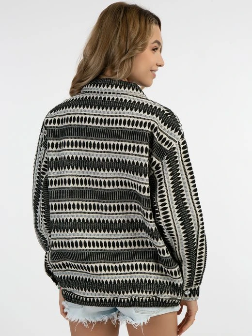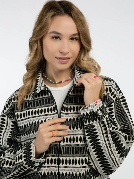 An kühlen Sommertagen oder Abenden ist der bunt gewebte Jaquard-Blouson von IZIA ein echter Eyecatcher. Die aus einem Baumwollgemisch gewebte Jacke punktet dabei nicht nur durch ein trendstarkes Ethno-Muster, sondern auch durch die eingearbeiteten Metallicgarne, die der Jacke einen glänzenden Schimmer verleihen. Im ganz klassischen Blouson-Stil verfügt sie über einen Klappkragen und zwei seitliche Eingrifftaschen. Die langen Ärmel enden in Manschetten, die mit goldfarbenen Strasssteinknöpfen veredelt sind. Ein weiches Innenfutter krönt das Design, das auch im angesagten Beach-Club für Furore sorgt.