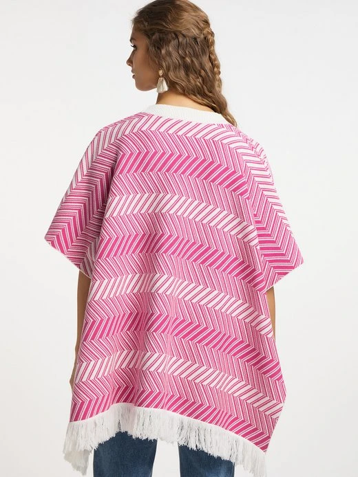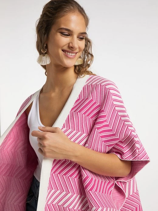 Poppige Sommerfarben dominieren den lässigen Strickponcho von IZIA. Das im offenen Design gehaltene Modell garantiert ein cosy Summer-Feeling. Das weiche Garn aus einem Baumwoll-Viskose-Mix macht den Poncho zu einem idealen Begleiter an kühlen Sommertagen und Abenden. Der kontrastierende Rippstrick und die Fransen am Saum verleihen dem Design einen frischen Twist.