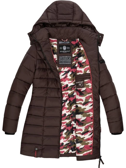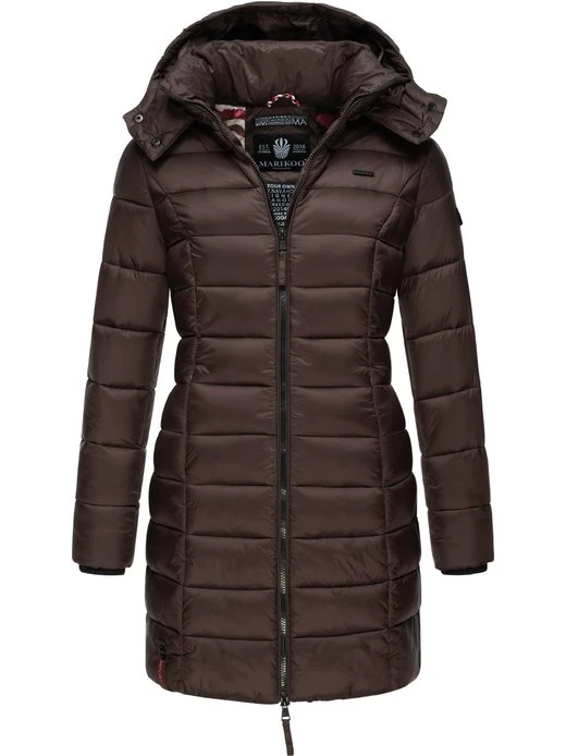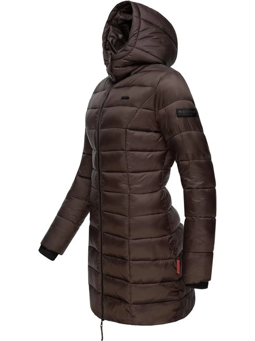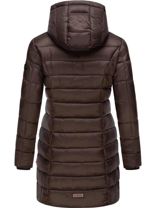 Kontrastfarbene Details wie die Rippstrickbündchen oder der Frontreißverschluss sorgen für einen coolen Look – die lange, gesteppte Jacke ist ein wahrer Eyecatcher.