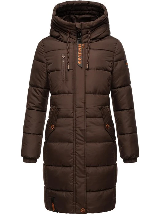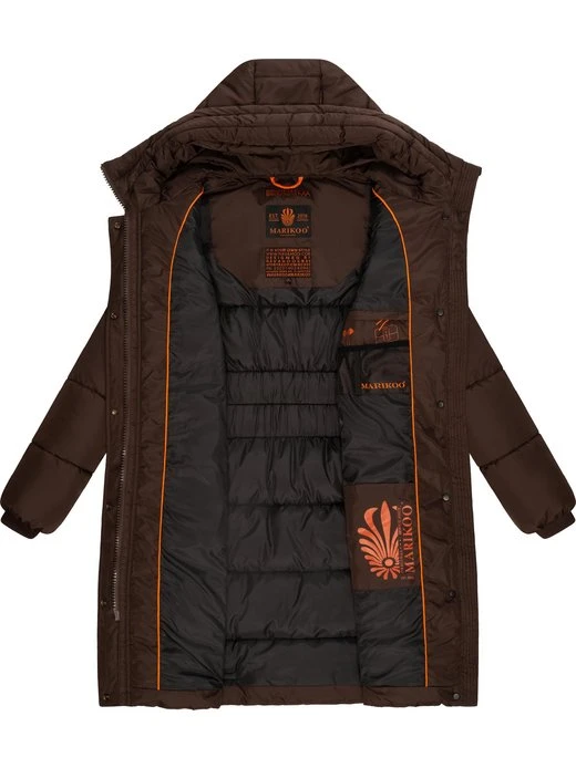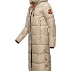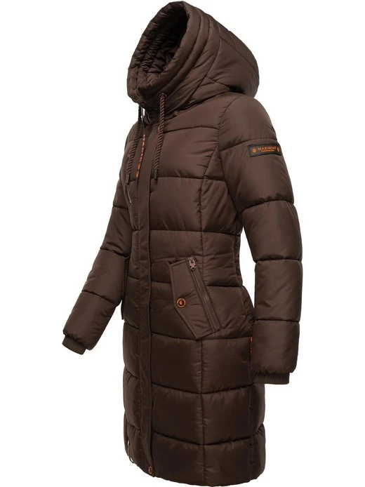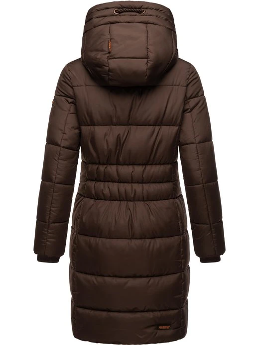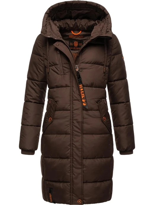 Langer Damen Steppmantel mit top Länge bis kurz über die Knie, gemütlich großer Kapuze und kontrastfarbenen Elementen von der Marke Marikoo.