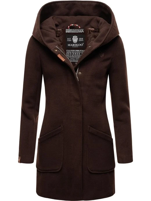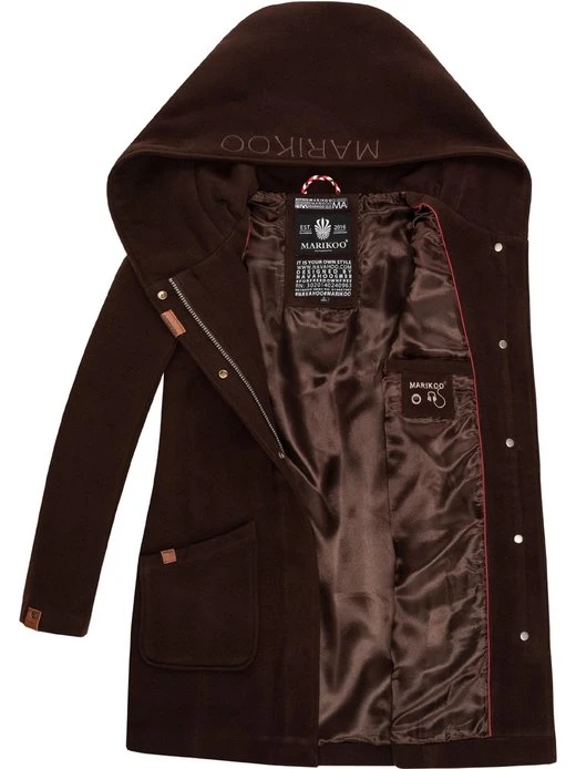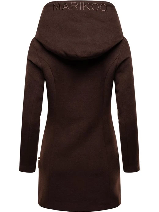 Edler Damen Mantel in Wollmantel-Optik mit großer Kapuze von Marikoo, perfekt kombinierbar zu eleganten oder urban Looks.
