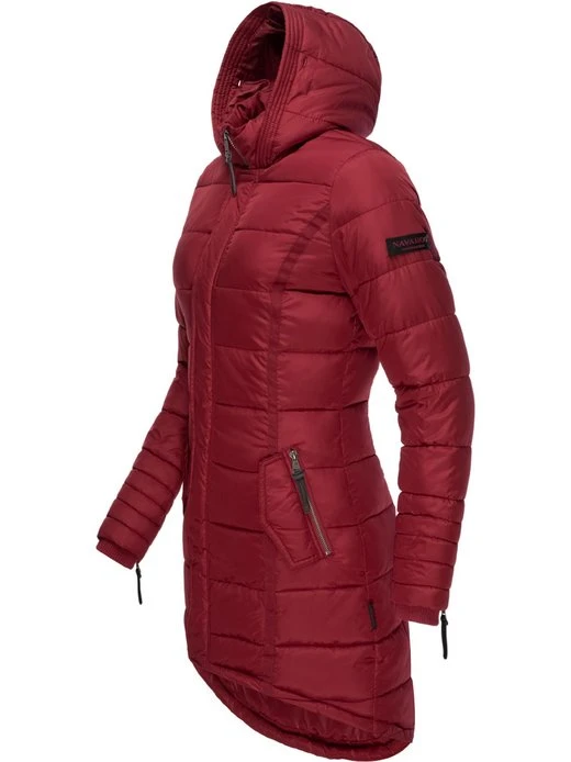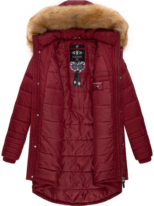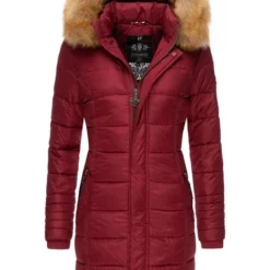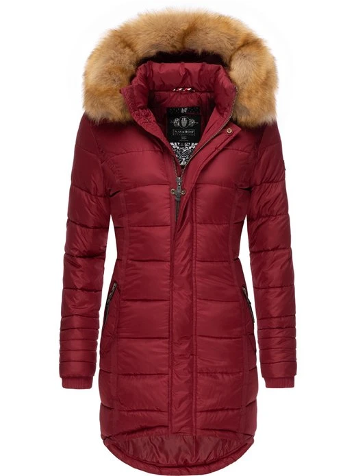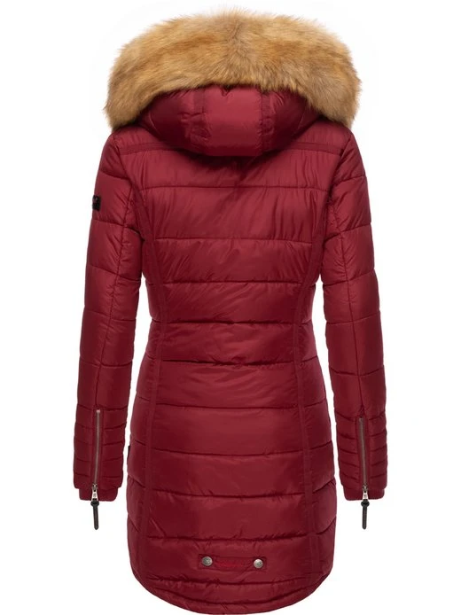 - Moderner Steppmantel mit abnehmbarer Kunstfell- Kapuze