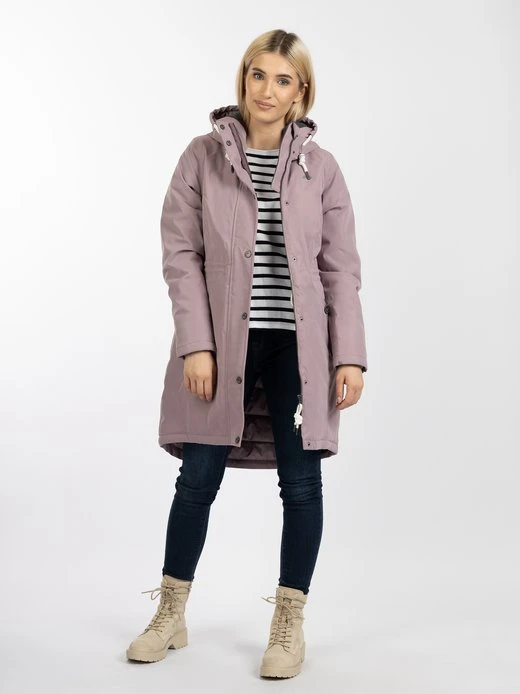Die hochwertige Outdoor-Performance von Schmuddelwedda ist der Schlüssel zu stressfreien Wintertagen. Dazu gehört ein beschichtetes Material, dass den Mantel wind- und wasserdicht macht, eine Wattierung, mit der frieren zu Vergangenheit gehört und ein weiches Innenfutter aus Polar-Fleece. Ein verdeckter Reißverschluss, ein hoher Stehkragen mit Kapuze, eine innen liegende Taillenkordel sowie die Rippstrickbündchen an den Ärmeln ergänzen den Winterschutz. Das Modell selber ist tailliert geschnitten, der Tunnelzug in der Taille sorgt zudem für eine feminine Silhouette. Detailverliebte Logo-Accessoires sind in ganz in klassischer Schmuddelwedda Manier gestaltet. Und sollte der Mantel doch mal zu warm sein, dann können Sie ihn mit den Trägern, die sich im Inneren der Jacke befinden, einfach um die Schultern tragen und die Hände bleiben frei.