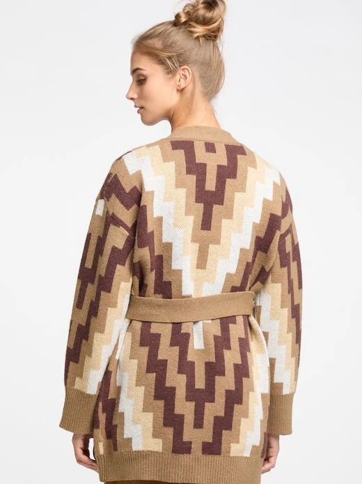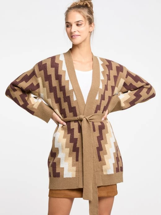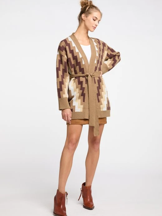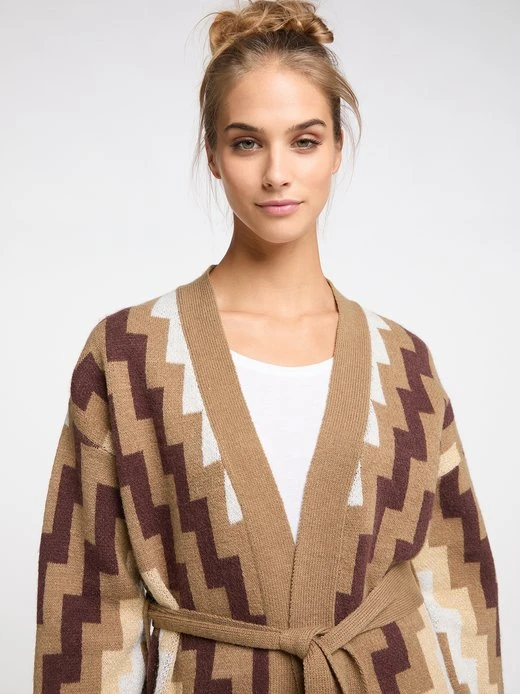 Ein Hauch von Retro umgibt den offenen Strick Cardigan von usha FESTIVAL. Die geometrischen Muster sind zudem mit feinen Metallic-Fäden durchzogen, was der Jacke einen leichten Glitzer verleiht. Das leger geschnittene Modell kann mit dem Strickgürtel auf Taille gezogen werden. Das weiche Garngemisch wird durch weite Rippstrickbündchen an den Ärmeln finalisiert.